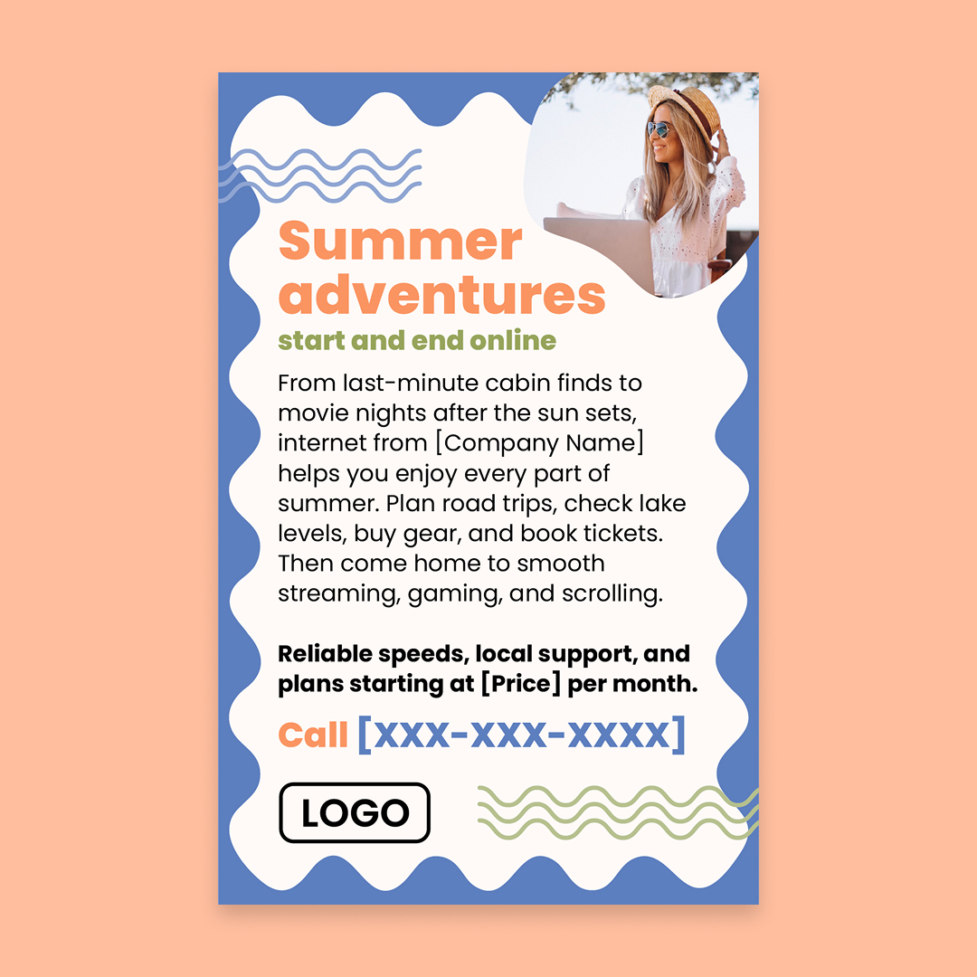 With customization, this piece will include your company name, logo, colors, phone number, and price (as in “starting at just [Price] per month”).