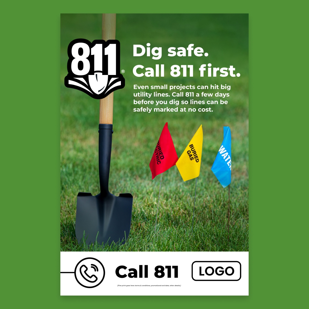The colors and style for this campaign use the branding guidelines provided by 811, so colors are not customizable. With customization, this piece will include your company logo.
