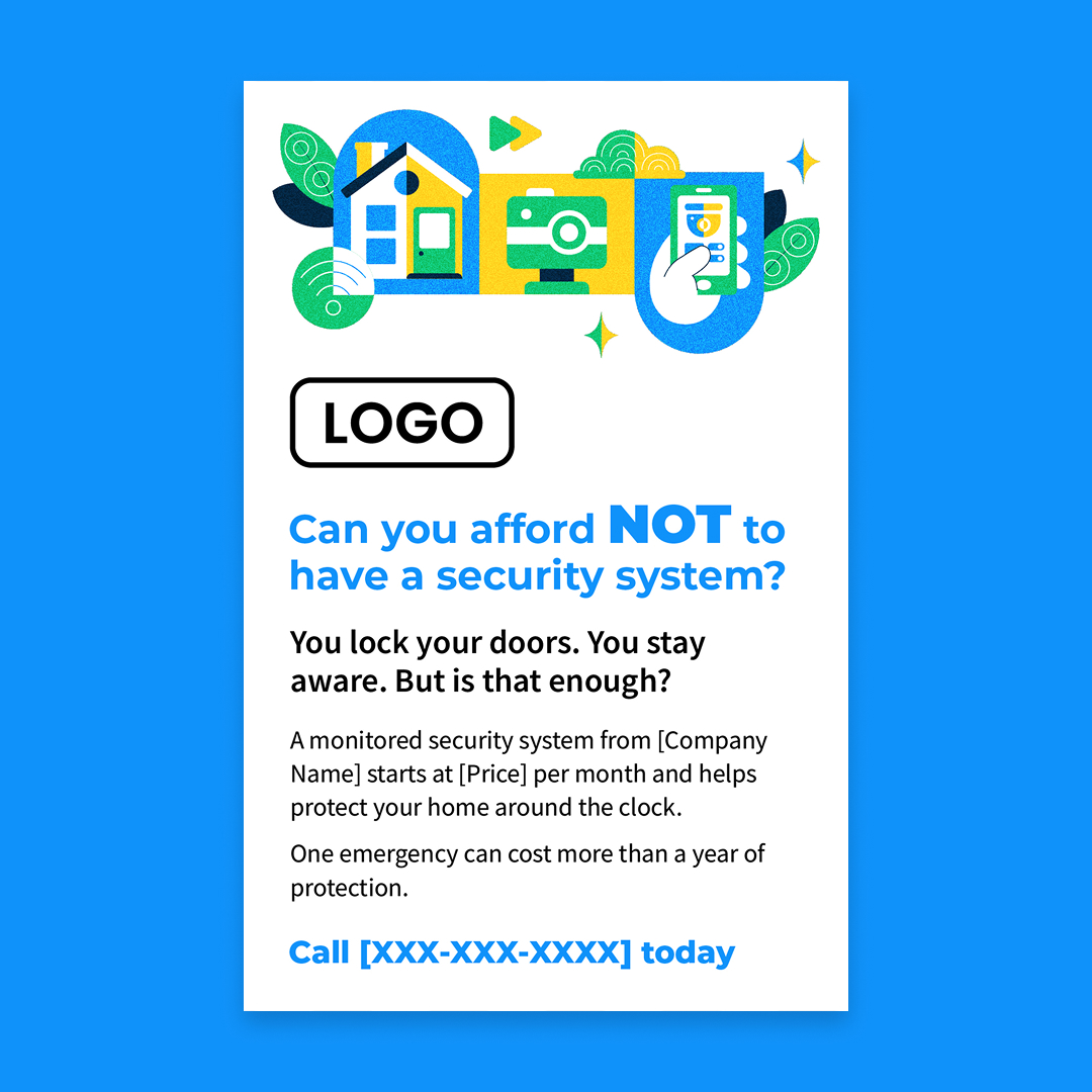 With customization, this piece will include your company name, logo, colors, phone number, and price (as in “starting at just [Price] per month”).