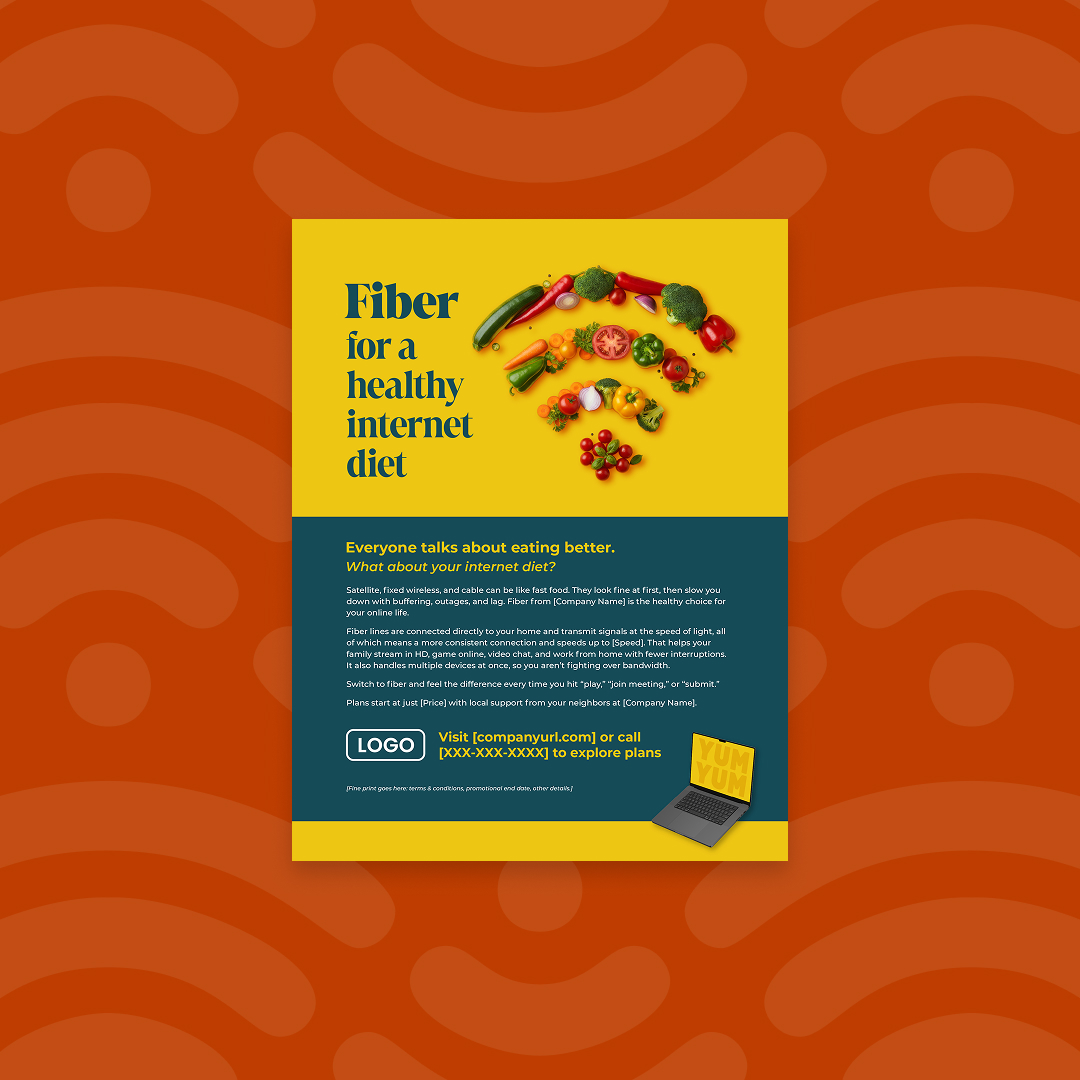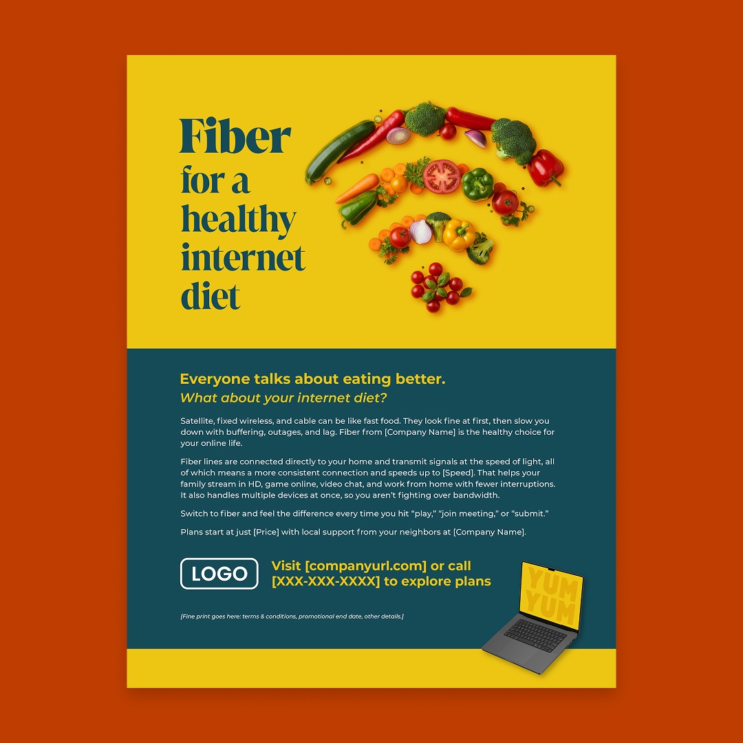 With customization, this piece will include your company name, logo, colors, website address, phone number, price (as in “starting at just [Price] per month”), and speed (as in “speeds up to [Speed]”).