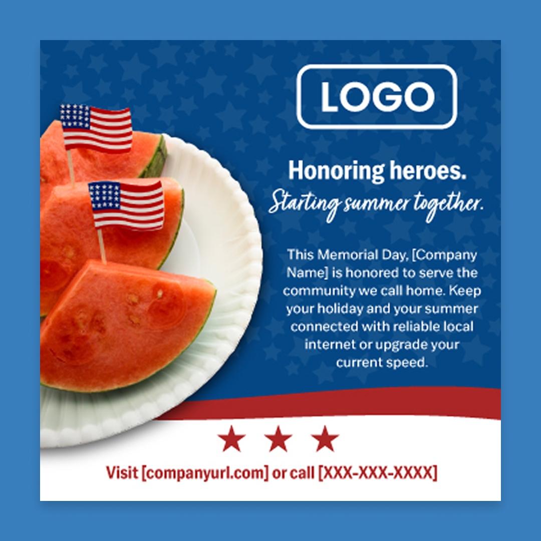 With customization, this piece will include your company name, logo, colors, website address, and phone number. If you want to keep the red, white, and blue design, please select the “The colors shown in the example” option below.