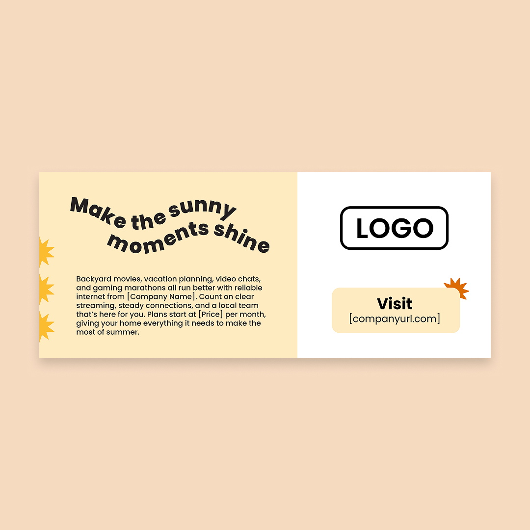 With customization, this piece will include your company name, logo, colors, website address, and price (as in “starting at just [Price] per month”).