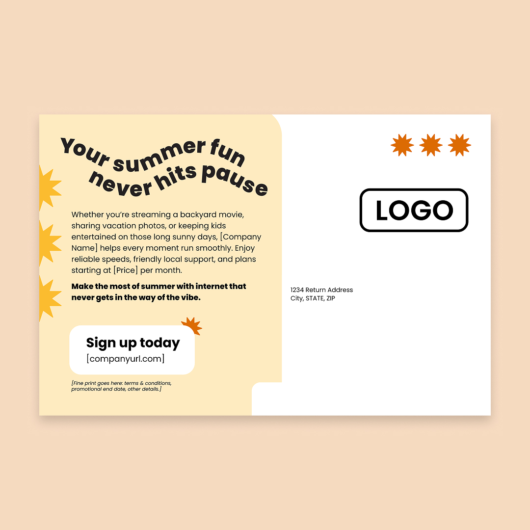 With customization, this piece will include your company name, logo, colors, website address, and price (as in “starting at just [Price] per month”).