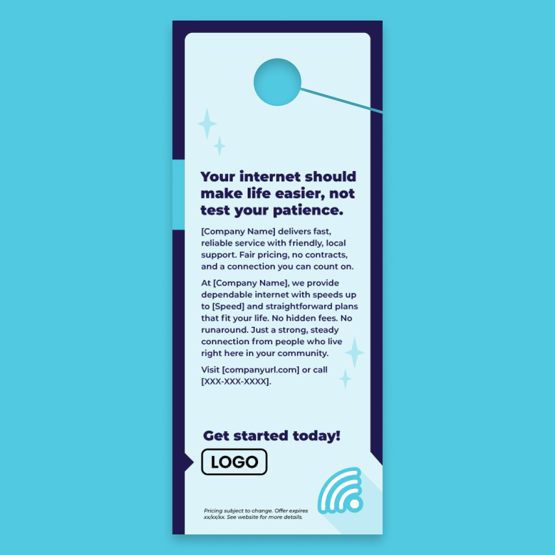 With customization, this piece will include your company name, logo, colors, website address, phone number, and speed (as in (“speeds up to [Speed]”).