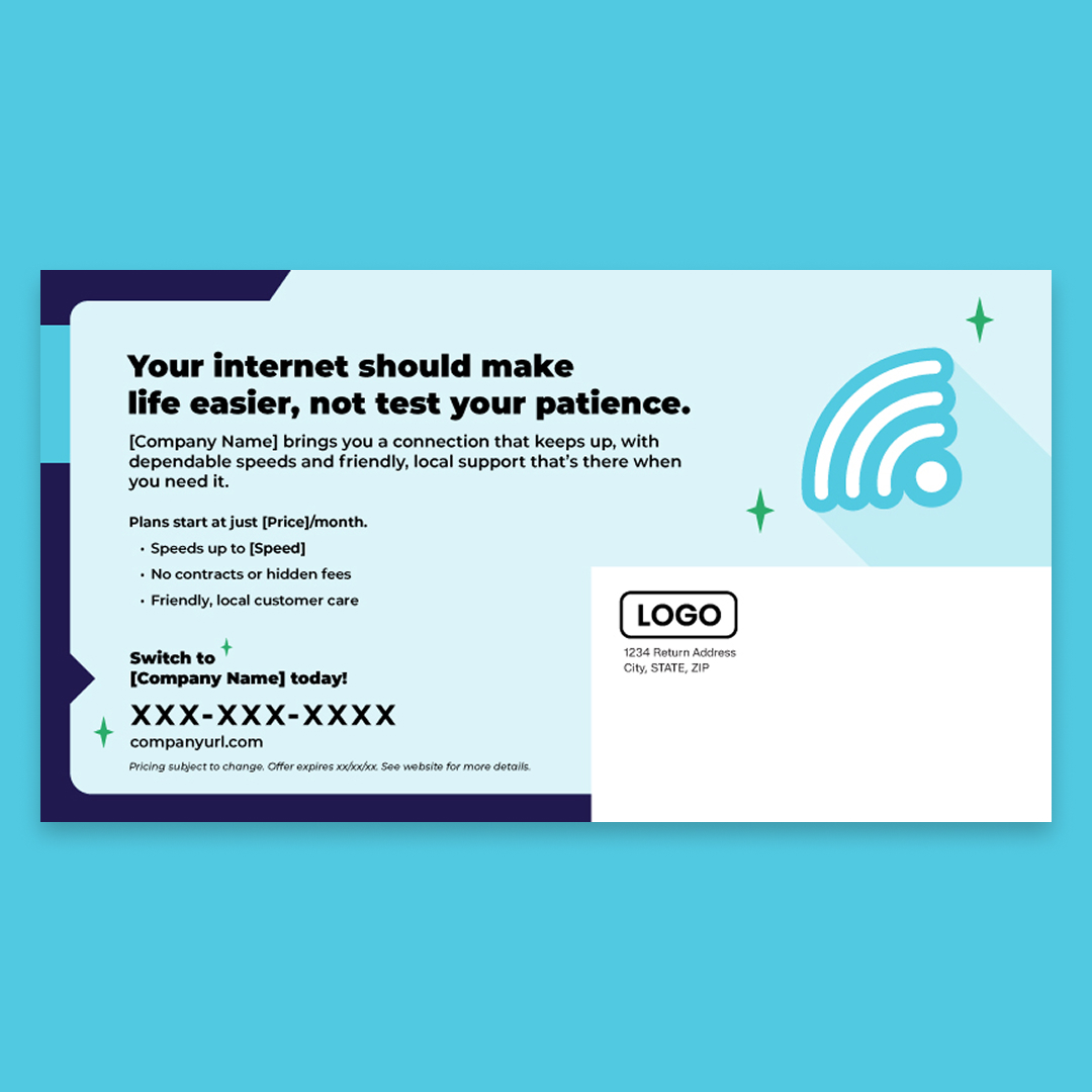 With customization, this piece will include your company name, logo, colors, website address, phone number, price (as in “starting at just [Price] per month”), and speed (as in “speeds up to [Speed]”).