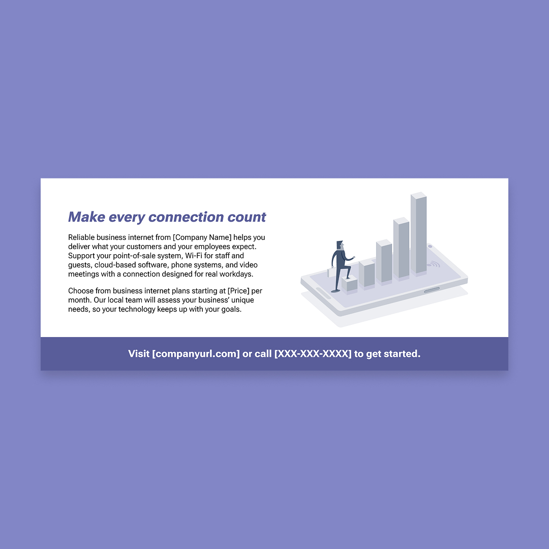 With customization, this piece will include your company name, logo, colors, website address, phone number, and price (as in “starting at just [Price] per month”).