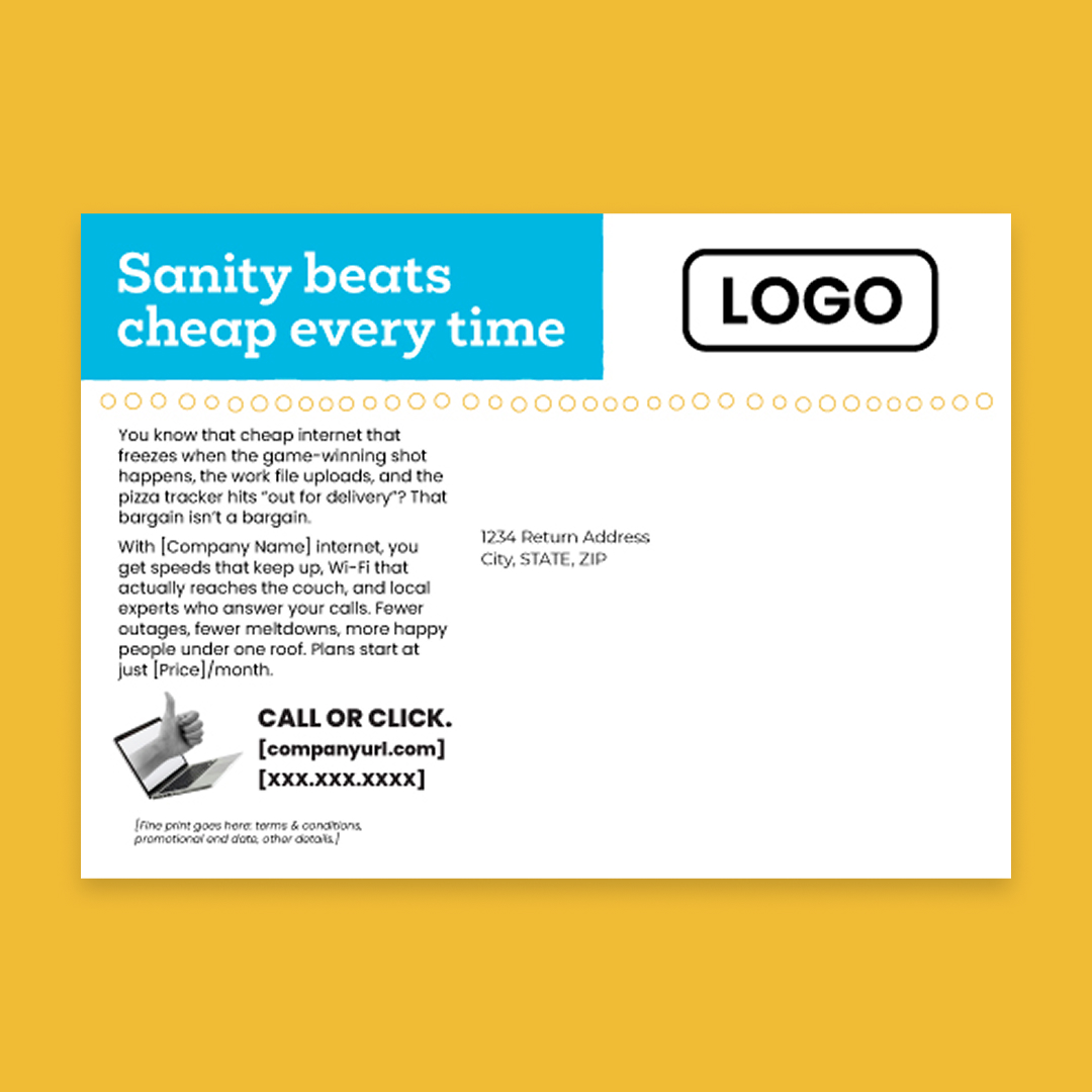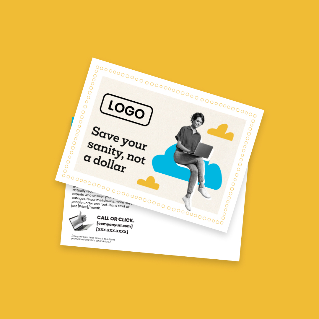 With customization, this piece will include your company name, logo, colors, website address, phone number, and price (as in “starting at just [Price] per month”).