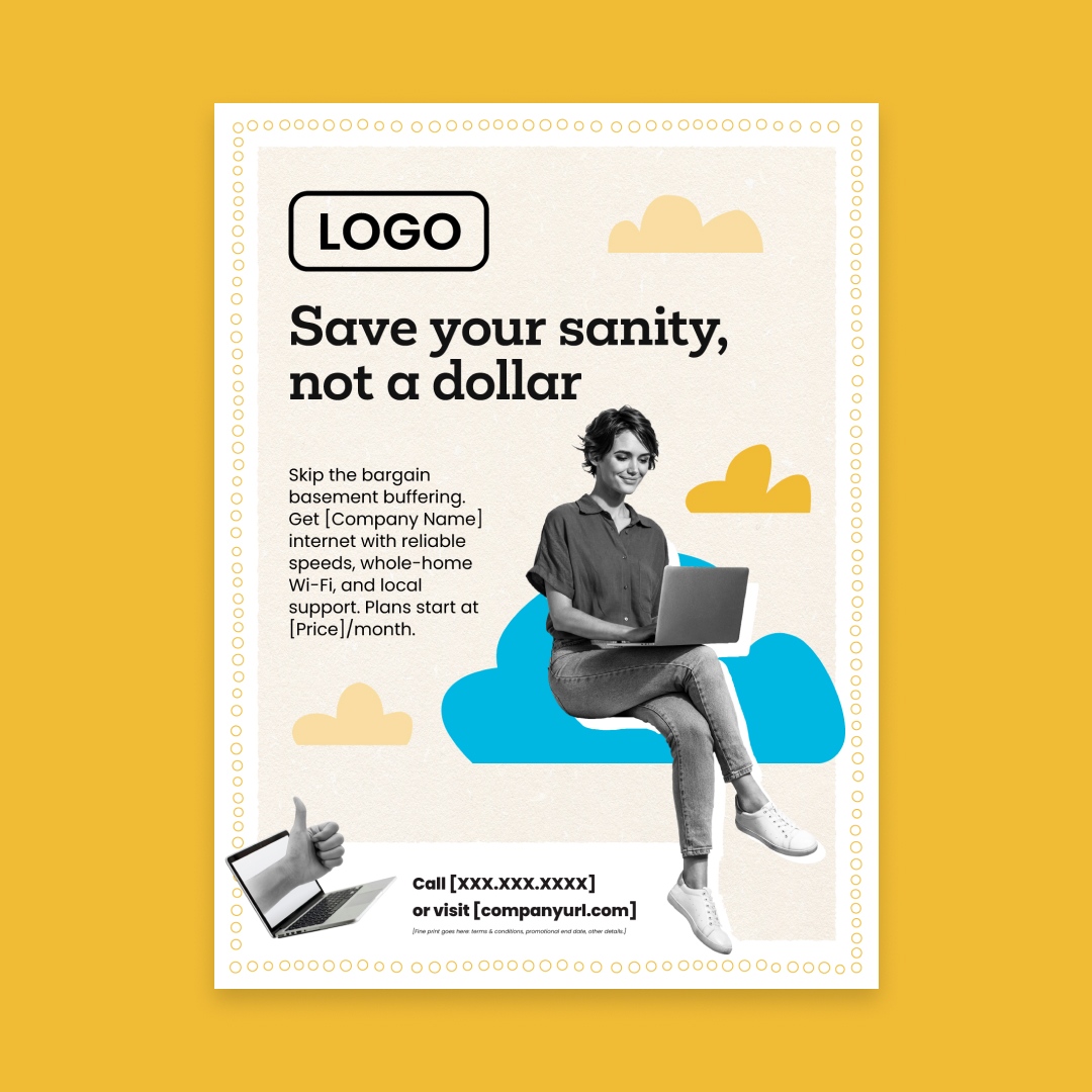 With customization, this piece will include your company name, logo, colors, website address, phone number, and price (as in “starting at just [Price] per month”).