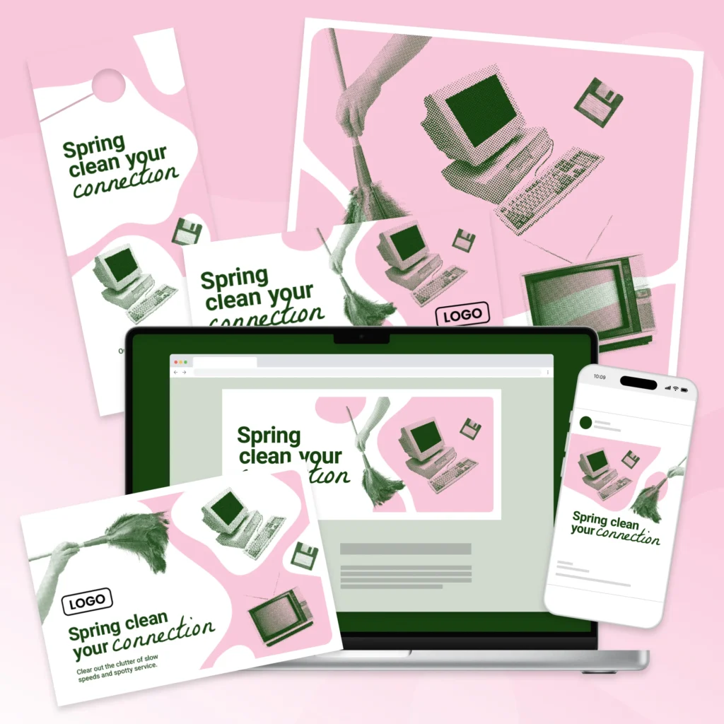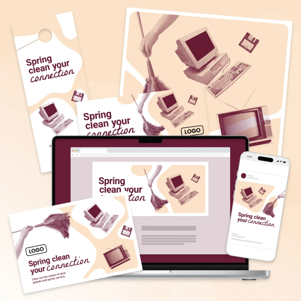 This campaign uses spring cleaning as a metaphor for switching from slow, unreliable internet to fast, frustration-free internet. Motivate potential customers to declutter their digital lives by switching to your company’s local internet and remind existing customers they’ve already made the smart, clutter-free choice.