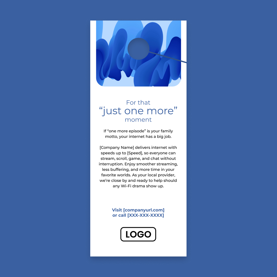 With customization, this piece will include your company name, logo, colors, website address, phone number, and speed (as in “speeds up to [Speed]”).