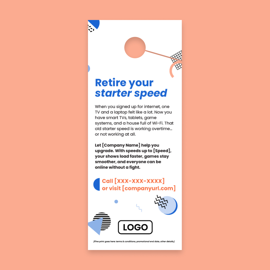 With customization, this piece will include your company name, logo, colors, website address, phone number, and speed (as in “speeds up to [Speed]”).