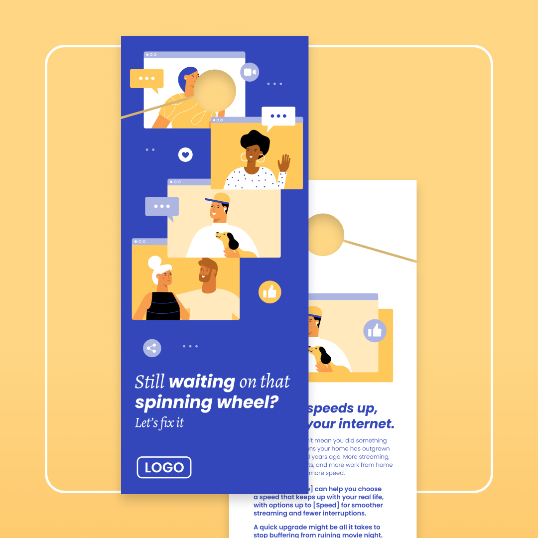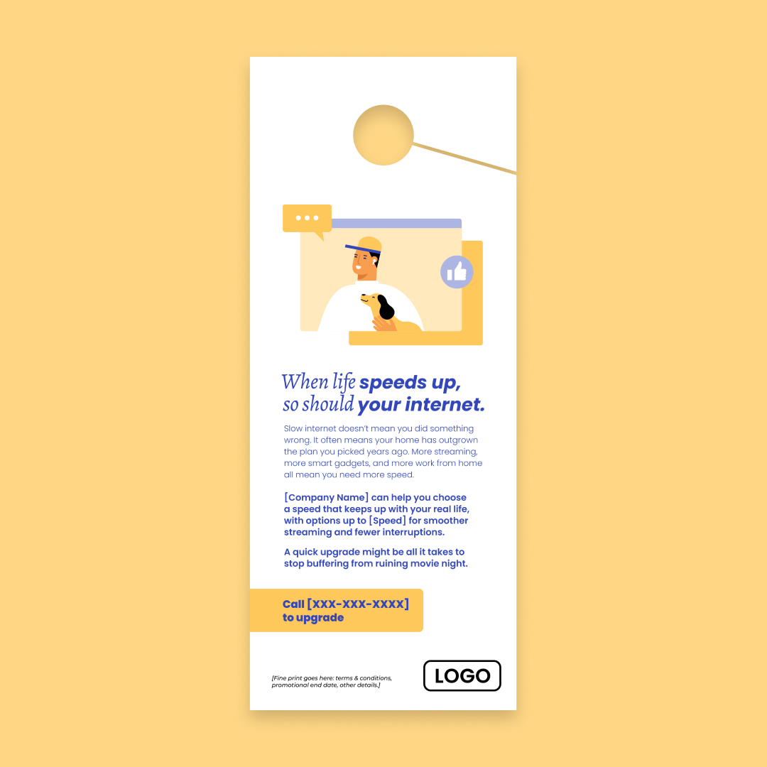 With customization, this piece will include your company name, logo, colors, phone number, and speed (as in “speeds up to [Speed]”).