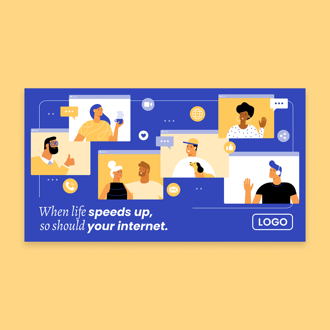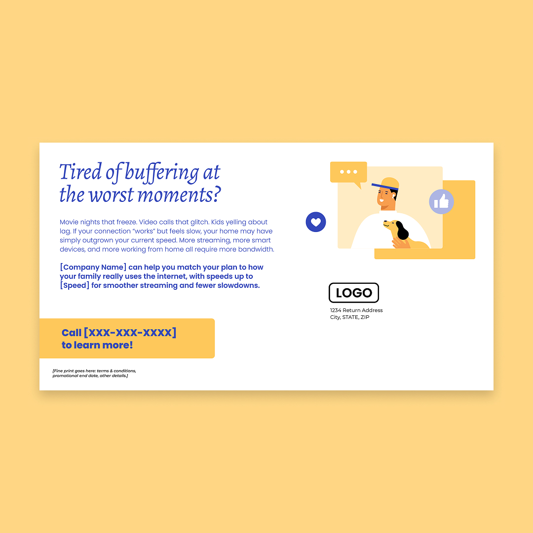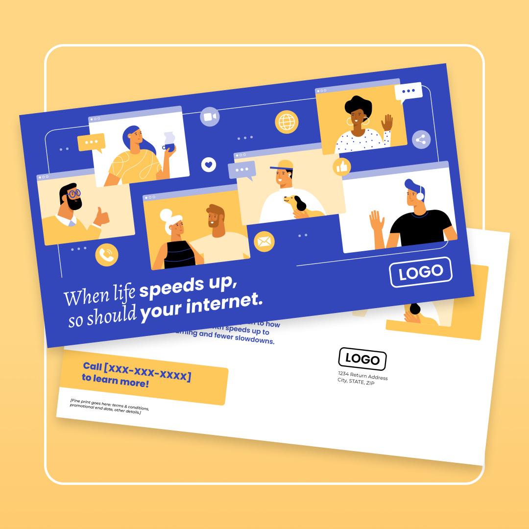 With customization, this piece will include your company name, logo, colors, phone number, and speed (as in “speeds up to [Speed]”).