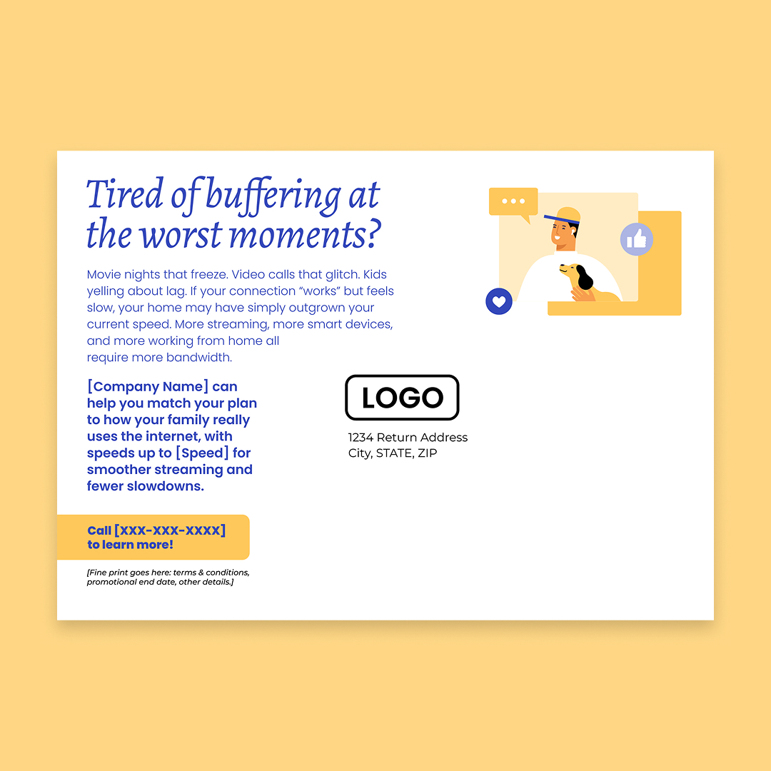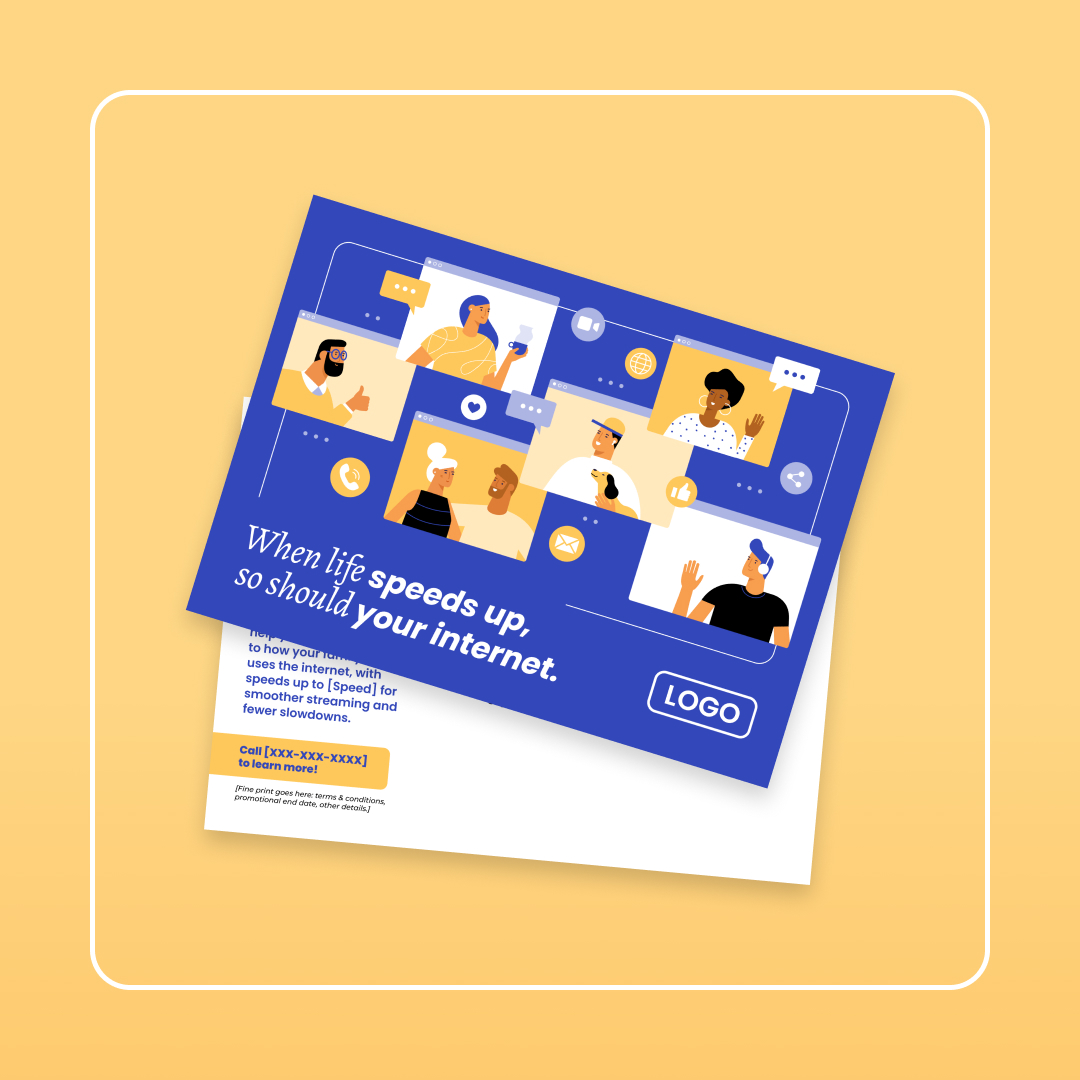 With customization, this piece will include your company name, logo, colors, phone number, and speed (as in “speeds up to [Speed]”).